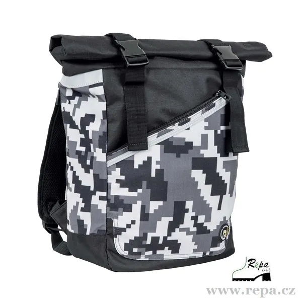 Prostorný jednokomorový batoh v kamuflážovém potisku.