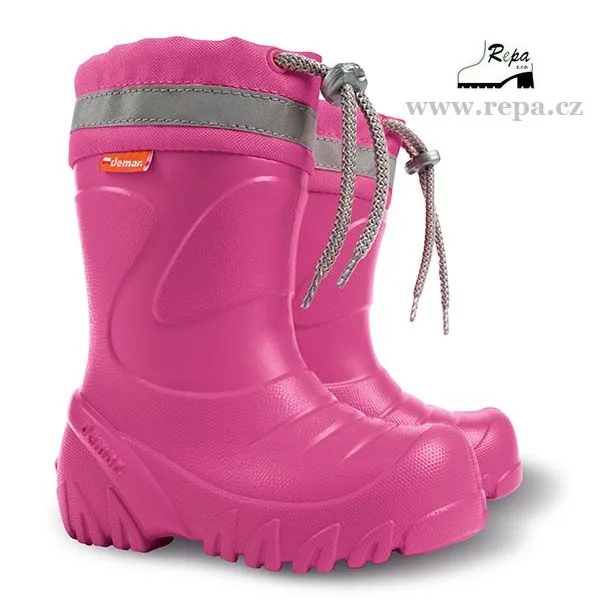 Dámské zateplené holínky demar MAMMUT SM jsou ideální pro deštivé podzimní a zimní počasí. Barva holinek je růžová. Mají hrubší protiskluzovou podrážku zajišťující bezpečnost chůze. Holinka je velice pohodlná a extra lehká. Materiál je vysoce kvalitní a odolný kopolymer EVA. Na obuvi je bezpečnostní reflexní pásek pro dobrou viditelnost dítěte ve tmě. Na svršku je zatahovací nástavec na tkaničku proti padání nečistot do holínky. Holínky MAMMUT SM poskytují vynikající uživatelský komfort a to i při velmi nízkých teplotách, což bylo potvrzeno zkouškou v kryogenické komoře (materiál testován do - 30°C).