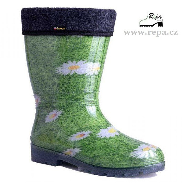 Dámské zateplené holinky RAINNY LUX PRINT jsou ideální pro deštivé jarní a podzimní počasí. Barva holinek zelená s moderním designem květin. Mají hrubší protiskluzovou podrážku zajišťující bezpečnost chůze. Holinka je velice pohodlná a lehká. Materiál je vysoce kvalitní a odolné PVC podšité příjemnou textilií. Boty mají certifikát - označení CE.