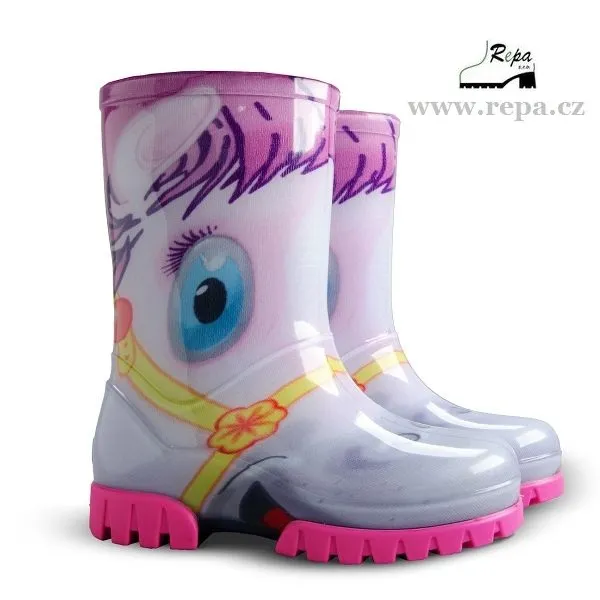 Dívčí holínky TWISTER PRINT jsou ideální pro deštivé letní počasí. Barva holinek je bílo-růžová stylově imitující poníka.Mají hrubší protiskluzovou podrážku zajišťující bezpečnost chůze. Holinka je velice pohodlná a lehká. Materiál je vysoce kvalitní a odolné PVC podšité příjemnou textilií. Na patě obuvi je bezpečnostní reflexní pásek pro dobrou viditelnost dítěte ve tmě.
