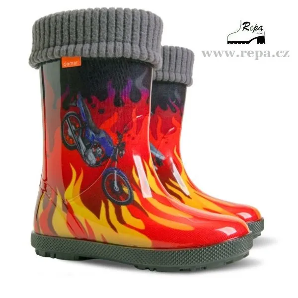 Dětské zateplené holínky HAWAI LUX EXCLUSIVE jsou ideální pro deštivé letní a podzimní počasí. Barva holinek červeno-žlutá doplněna motivem motorky. Mají hrubší protiskluzovou podrážku zajišťující bezpečnost chůze. Holinka je velice pohodlná a lehká. Materiál je vysoce kvalitní a odolné PVC podšité příjemnou textilií. Na patě obuvi je bezpečnostní reflexní pásek pro dobrou viditelnost dítěte ve tmě.
