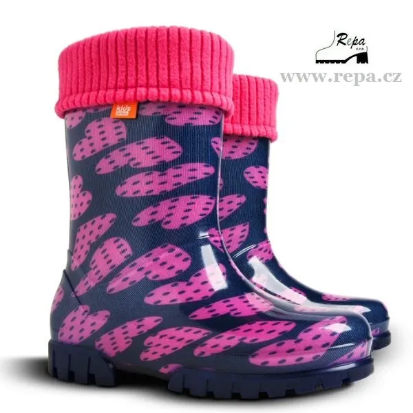 Dívčí zateplené holínky TWISTER LUX PRINT jsou ideální pro deštivé letní a podzimní počasí. Barva holinek tmavě modrá v kombinaci s ružovými srdíčky. Mají hrubší protiskluzovou podrážku zajišťující bezpečnost chůze. Holinka je velice pohodlná a lehká. Materiál je vysoce kvalitní a odolné PVC podšité příjemnou textilií. Na patě obuvi je bezpečnostní reflexní pásek pro dobrou viditelnost dítěte ve tmě.