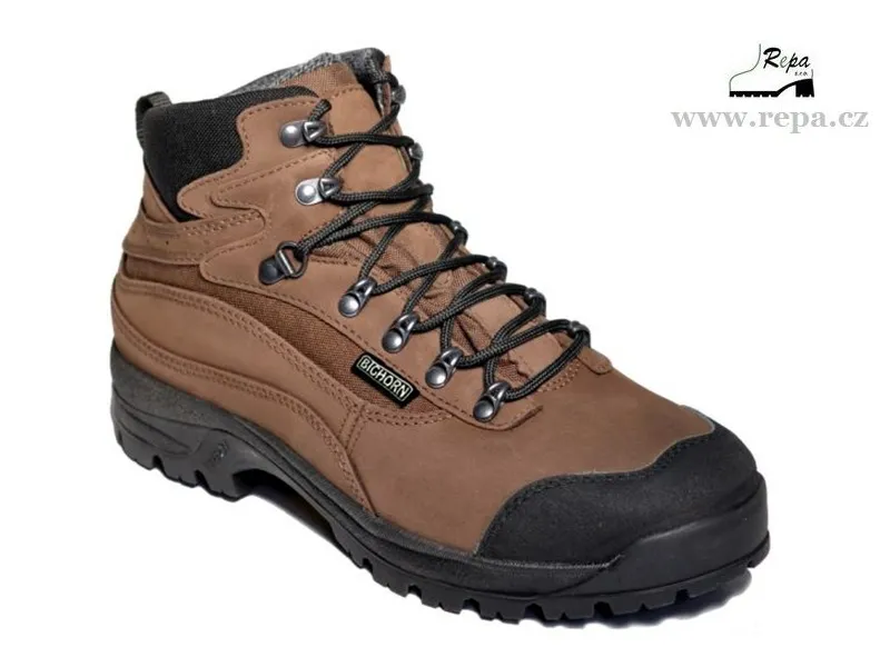 Pánská a dámská treková obuv BIGHORN je vhodná k celoročnímu užívání do náročných podmínek. Barva obuvi je hnědá. Doporučené používání pro horskou turistiku, outdoor, lovectví a myslivost. Svršek je vyroben ze silné voděodolné nubukové usně. Podšívka je ze speciální odolné textilie v kombinaci s izolační vrstvou THINSULATE a voděodolnou membránou BIG-TEX, která umožňuje prodyšnost obuvi z vnitřní strany ven a zamezuje pronikání vlhkosti do obuvi. Díky této membráně lze obuv nosit v mokrém prostředí. Pohodlná vložka CAMBRELLE z prodyšného materiálu. Podrážka VIBRAM z kvalitní pryže je pružná a velice přilnavá. Obuv je doplněna okopem na špičce. Boty mají systém rychlého šněrování s dvěmi háčky na vršku. Vyrobeno v EU.