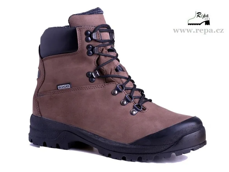 Pánská treková obuv Bighorn TIBERA je vhodná k celoročnímu užívání do náročných podmínek. Barva obuvi je hnědá. Doporučené používání pro horskou turistiku, outdoor, lovectví a myslivost. Svršek je vyroben ze silné voděodolné nubukové usně. Podšívka je ze speciální odolné textilie v kombinaci s izolační vrstvou THINSULATE a voděodolnou membránou BIG-TEX, která umožňuje prodyšnost obuvi z vnitřní strany ven a zamezuje pronikání vlhkosti do obuvi. Díky této membráně lze obuv nosit v mokrém prostředí. Pohodlná vložka CAMBRELLE z prodyšného materiálu. Podrážka VIBRAM z kvalitní pryže je pružná a velice přilnavá. Obuv je doplněna okopem na špičce. Boty mají systém rychlého šněrování s třemi háčky na vršku. Vyrobeno v EU.