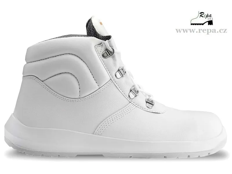 Šněrovací pracovní boty v bílé barvě s hydrofobním povrchem. Obuv vhodná pro pracovní prostředí, kde není potřeba ochranná špička. Boty s protiskluzovými vlastnostmi SRC.