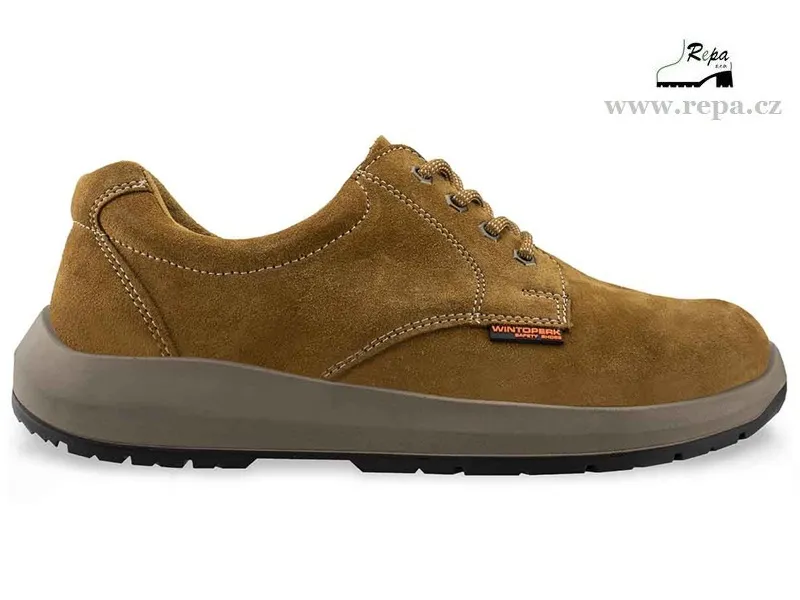 Vzdušné pracovní boty na šněrování z hnědé sametové kůže. Obuv vhodná pro pracovní prostředí, kde není potřeba ochranná špička. Boty s protiskluzovými vlastnostmi SRC.
