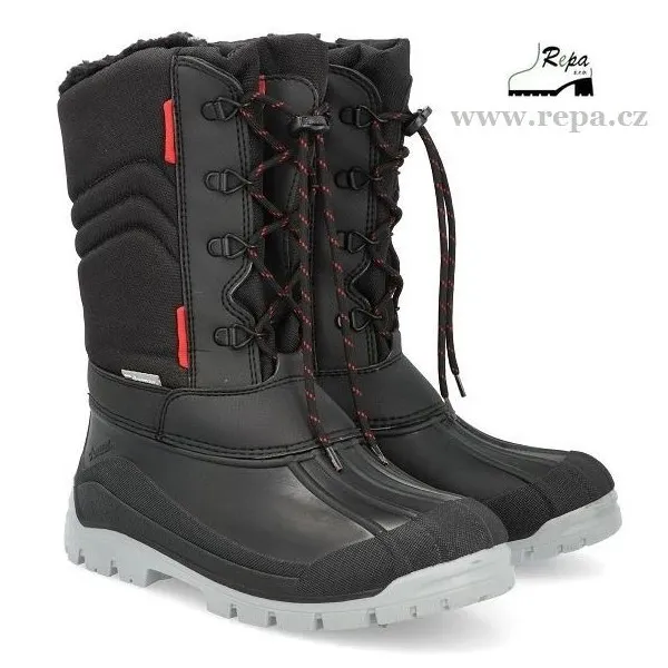 Dámská zimní obuv Voyager zateplená plyšovým kožíškem je vhodná do sněhu a mrazu. Barva sněhulí je černá. Sněhule jsou díky svému vzhledu a provedení velice pěkné a teplé. Nepromokavá spodní část je vyrobena z termokaučuku a vrchní díl z odolné textilie. Díky tkaničce si můžete nastavit šířku obuvi přesně pro vaše pohodlí. Tkanička navíc usnadní a zjednoduší obouvání obuvi. Na obuvi je bezpečnostní reflexní pásek pro dobrou viditelnost ve tmě. Mají hrubší protiskluzovou podrážku zajišťující bezpečnost chůze. Vyrobeno v EU.
