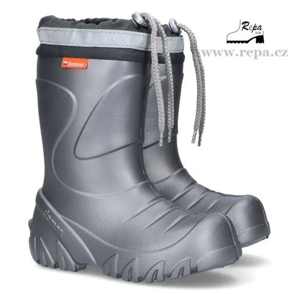 Dětské zateplené holínky MAMMUT jsou ideální pro deštivé podzimní a zimní počasí. Barva holinek je stříbrná. Mají hrubší protiskluzovou podrážku zajišťující bezpečnost chůze. Holinka je velice pohodlná a extra lehká. Materiál je vysoce kvalitní a odolný kopolymer EVA. Na obuvi je bezpečnostní reflexní pásek pro dobrou viditelnost dítěte ve tmě. Na svršku je zatahovací nástavec na tkaničku proti padání nečistot do holínky. Holínky MAMMUT S poskytují vynikající uživatelský komfort a to i při velmi nízkých teplotách, což bylo potvrzeno zkouškou v kryogenické komoře (materiál testován do - 30°C).