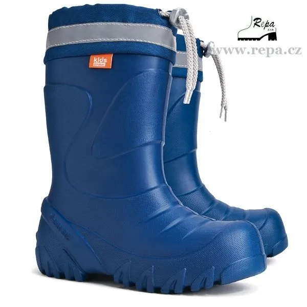 Dětské zateplené holínky MAMMUT jsou ideální pro deštivé podzimní a zimní počasí. Barva holínek je modrá. Mají hrubší protiskluzovou podrážku zajišťující bezpečnost chůze. Holinka je velice pohodlná a extra lehká. Materiál je vysoce kvalitní a odolný kopolymer EVA. Na obuvi je bezpečnostní reflexní pásek pro dobrou viditelnost dítěte ve tmě. Na svršku je zatahovací nástavec na tkaničku proti padání nečistot do holínky. Holínky MAMMUT S poskytují vynikající uživatelský komfort a to i při velmi nízkých teplotách, což bylo potvrzeno zkouškou v kryogenické komoře (materiál testován do - 30°C).