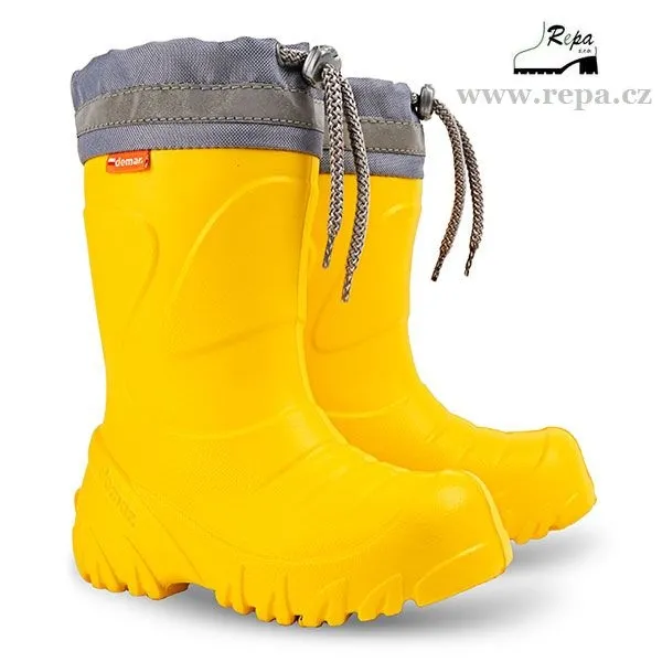 Dětské zateplené holínky MAMMUT jsou ideální pro deštivé podzimní a zimní počasí. Barva holínek je žlutá. Mají hrubší protiskluzovou podrážku zajišťující bezpečnost chůze. Holinka je velice pohodlná a extra lehká. Materiál je vysoce kvalitní a odolný kopolymer EVA. Na obuvi je bezpečnostní reflexní pásek pro dobrou viditelnost dítěte ve tmě. Na svršku je zatahovací nástavec na tkaničku proti padání nečistot do holínky. Holínky MAMMUT S poskytují vynikající uživatelský komfort a to i při velmi nízkých teplotách, což bylo potvrzeno zkouškou v kryogenické komoře (materiál testován do - 30°C).